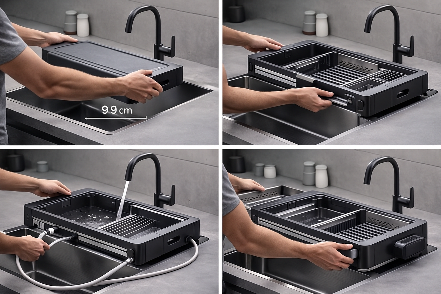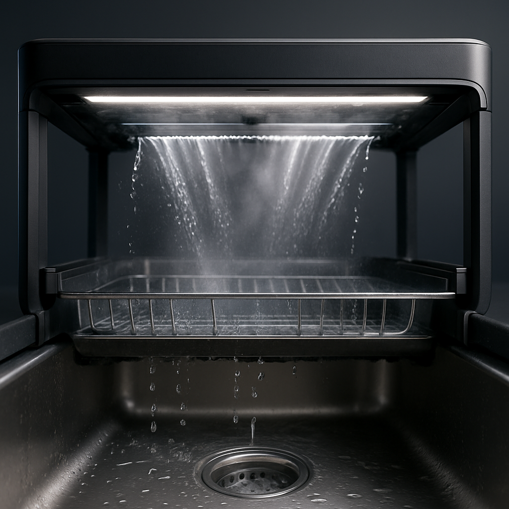 Премиальный складной модуль для мойки и сушки посуды прямо в обычной кухонной раковине, без встройки, без переделки коммуникаций.