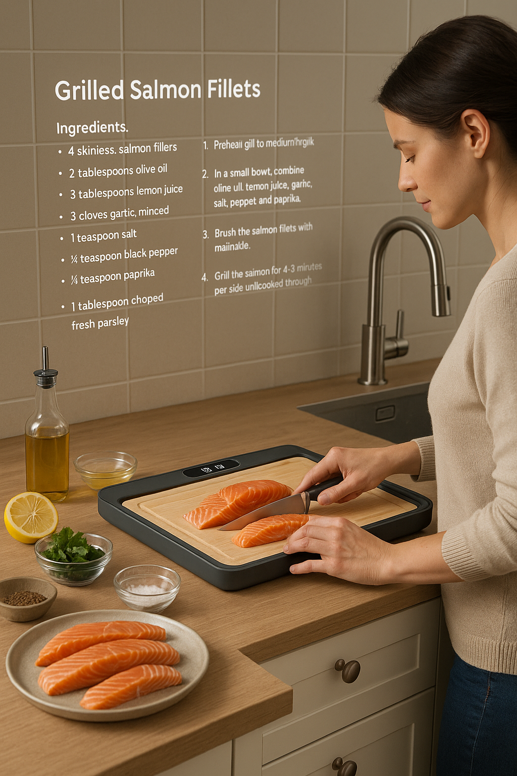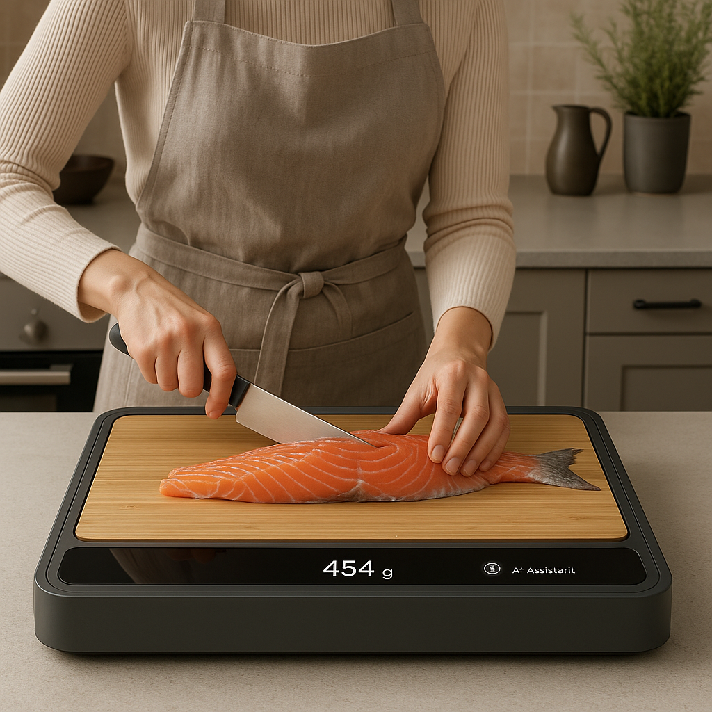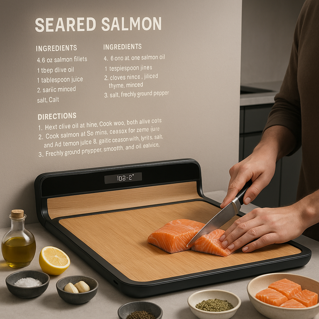 вниз → проекция на столешницу/разделочную зону (пошаговые инструкции, контуры нарезки, визуализация порций).