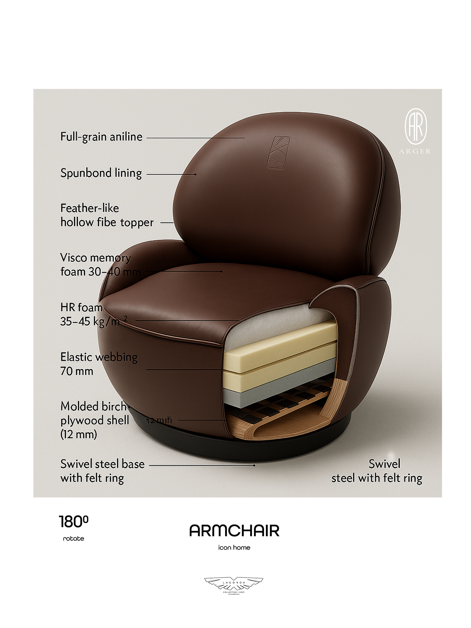 Upholstery: premium Italian velour/alcantara or full-grain Nappa leather, tailored with contrast leather piping; optional embossed ARGER monogram.
