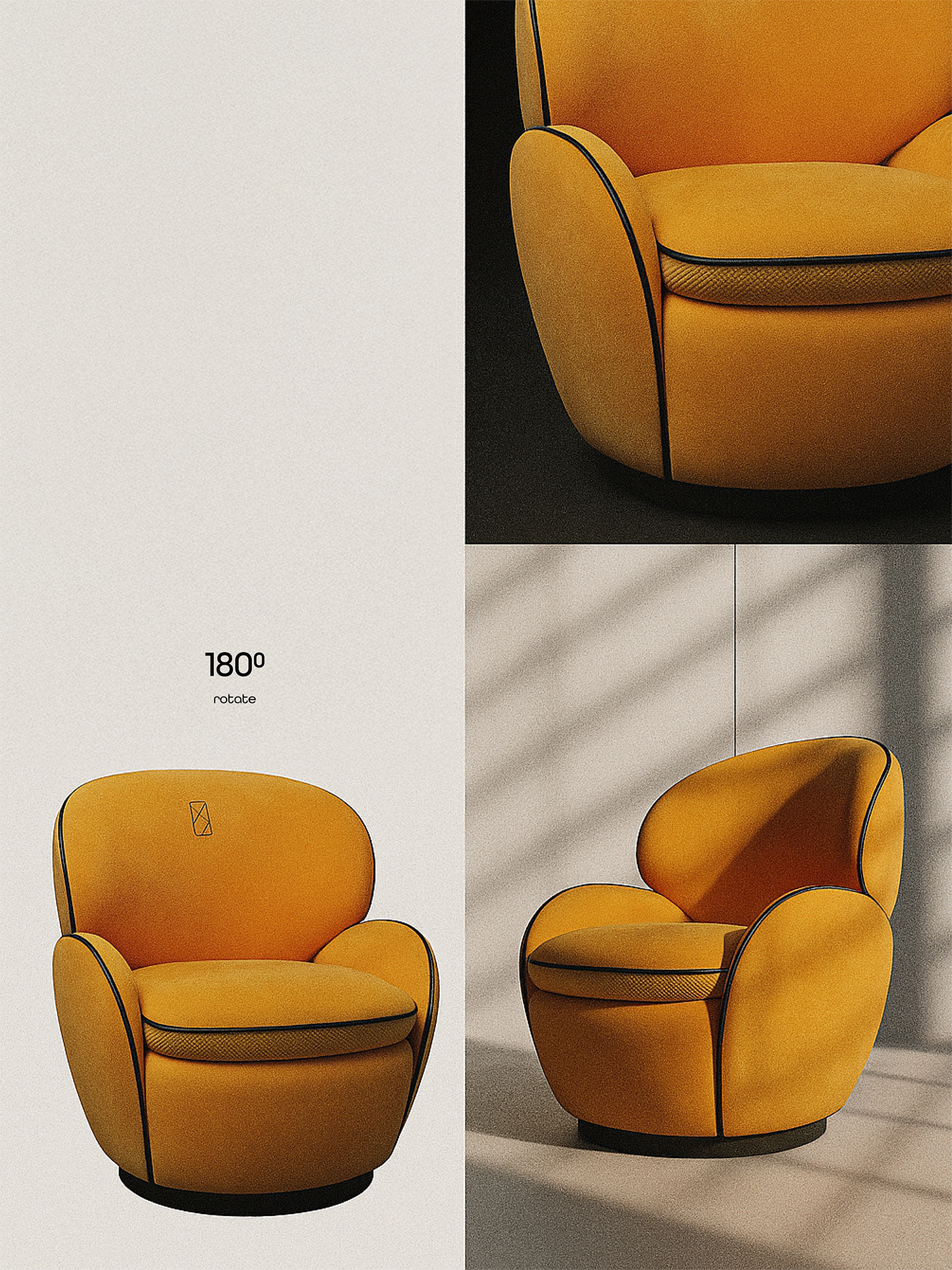 The seat welcomes with a cloud-soft first touch, while a resilient core preserves the chair’s crisp silhouette. A discreet plinth base visually “grounds” the volume and can be specified as a 360° swivel.
