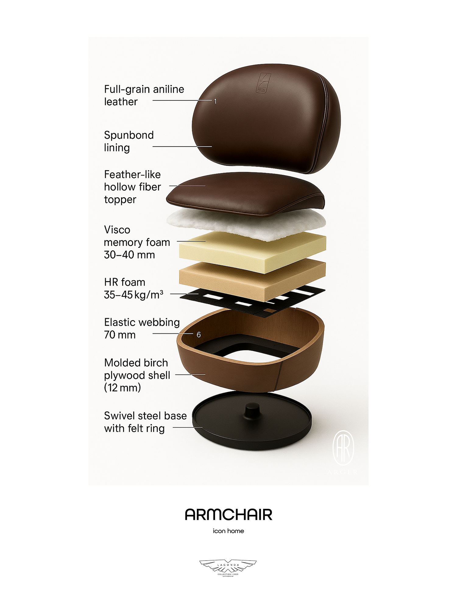 /alcantara or full-grain Nappa leather, tailored with contrast leather piping; optional embossed ARGER monogram.