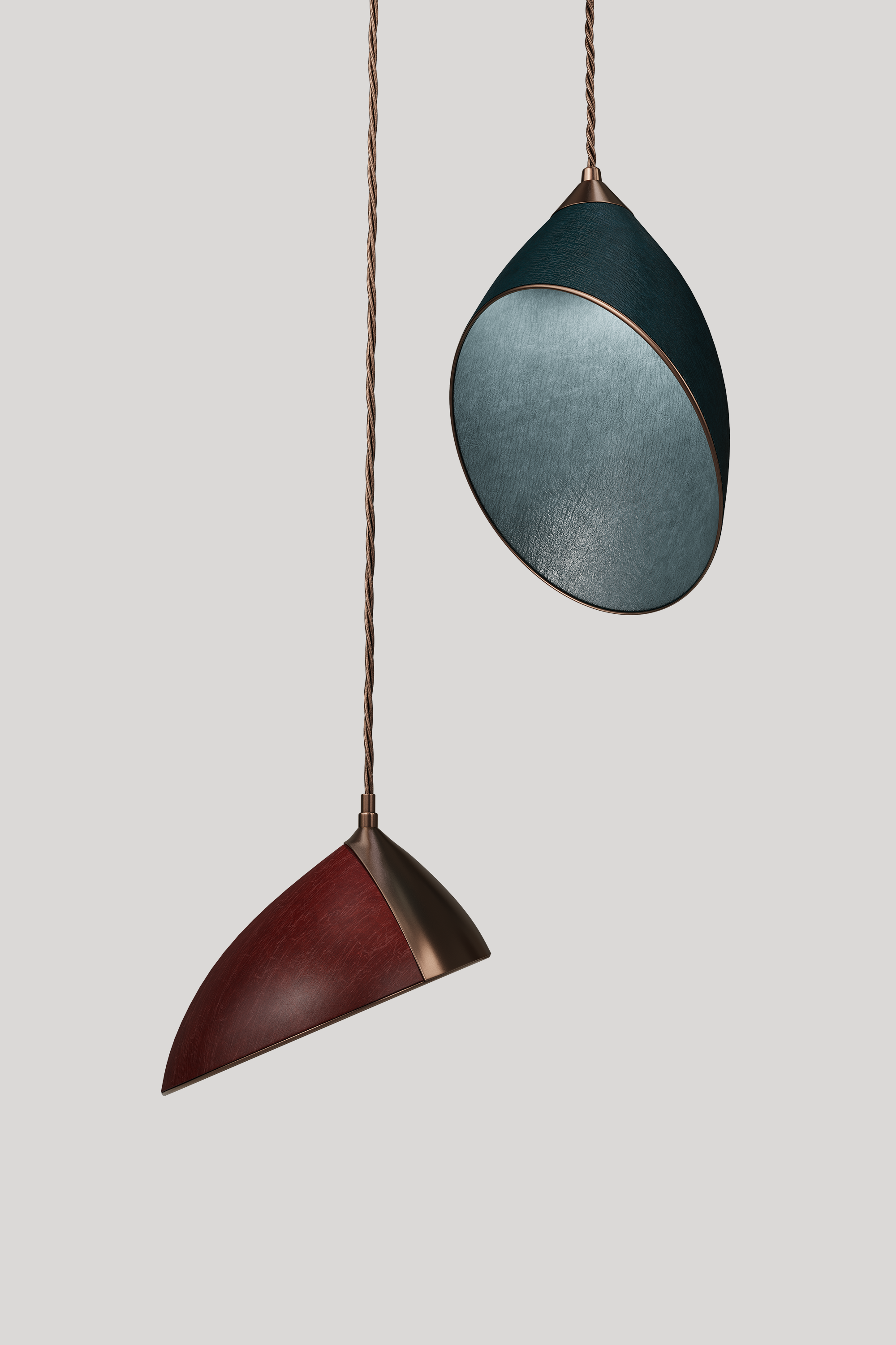 The contrast of noble Bordeaux and deep dark green highlights the sculptural shape of the lampshade.