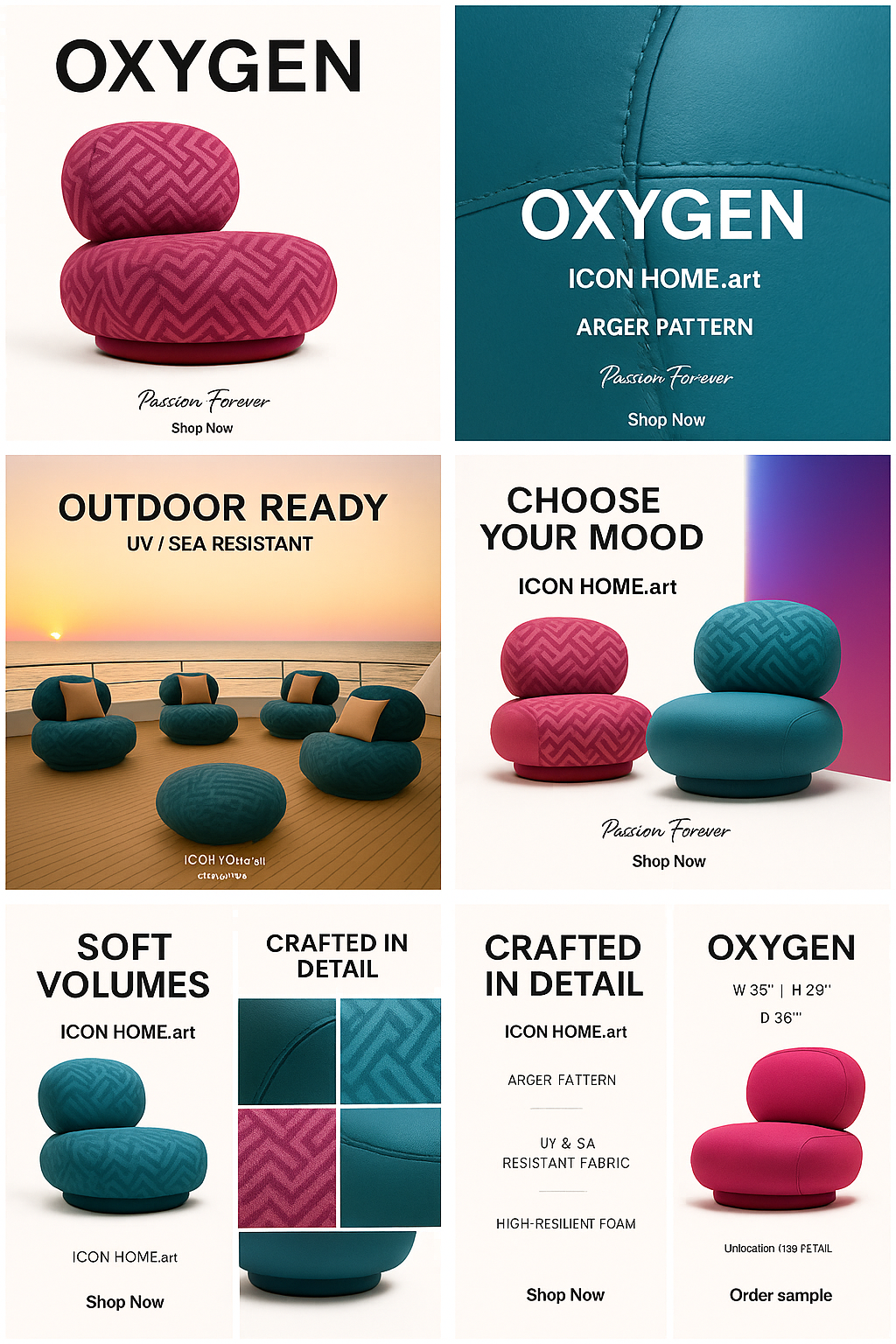 OXYGEN is a "breath" in upholstered furniture: light, airy volumes and flowing lines that seem to float in a wooden cocoon. An organic veneer shell hugs soft "island cushions", and graceful supports bring the silhouette into dynamics.