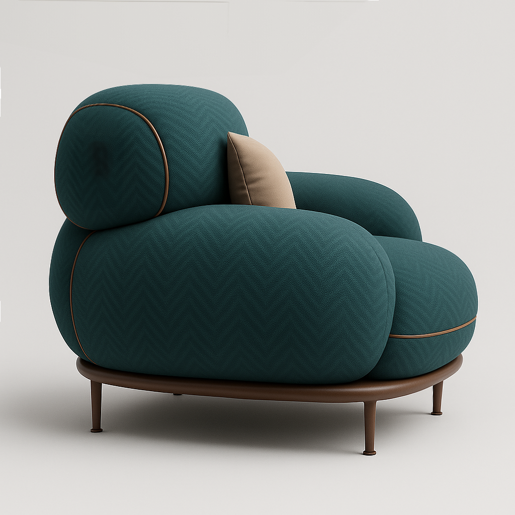 Materials: bent plywood + solid wood (walnut veneer), high-elastic foam, premium fabric/nubuck upholstery in ICON HOME pattern ivory, satin bronze metal fittings. Leather