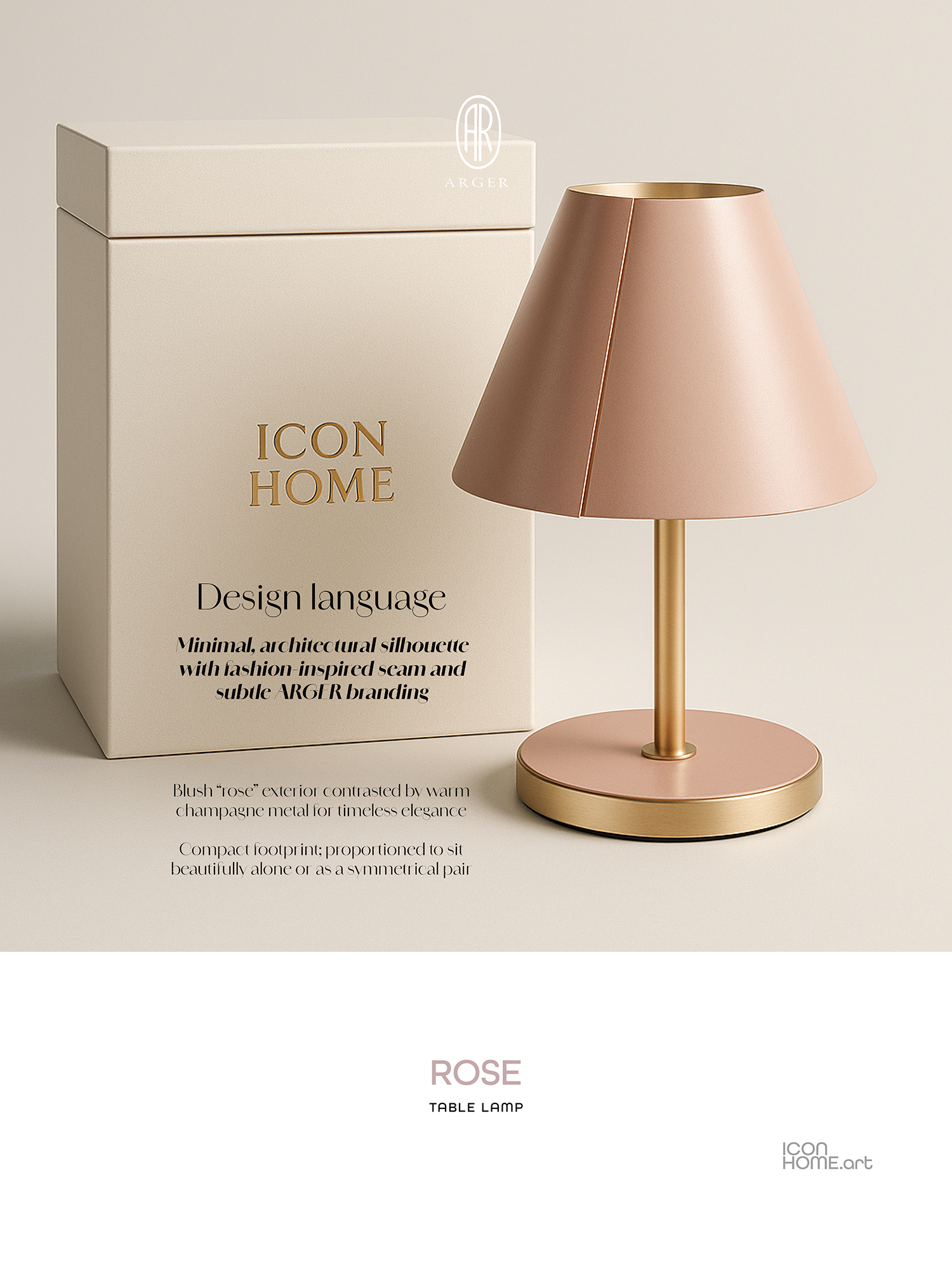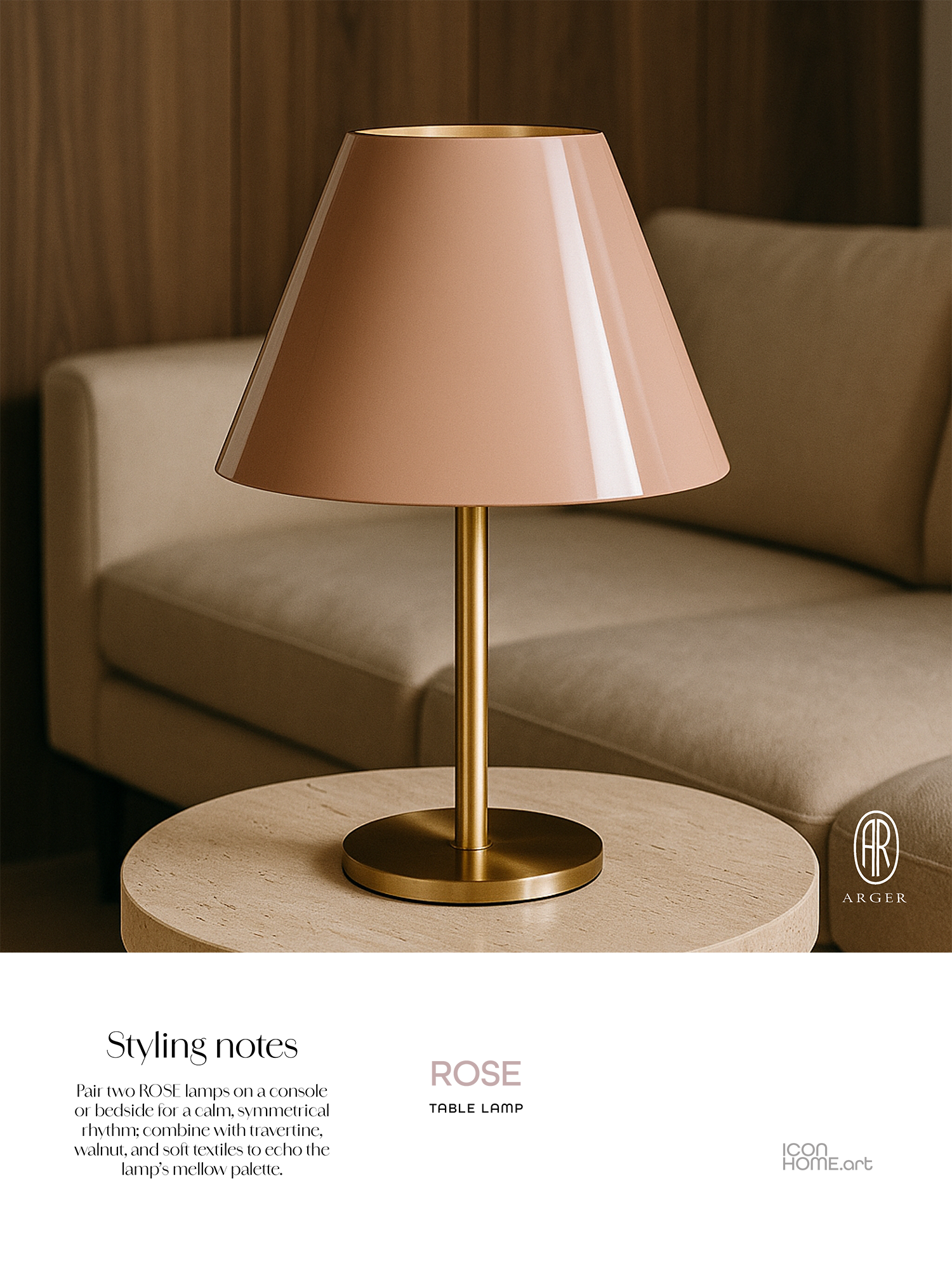Pair two ROSE lamps on a console or bedside for a calm, symmetrical rhythm; combine with travertine, walnut, and soft textiles to echo the lamp’s mellow palette.